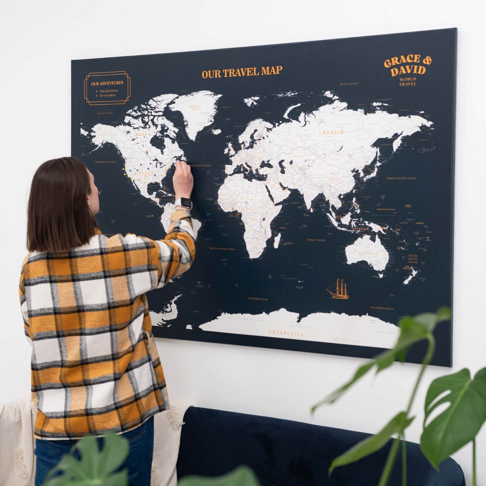 Large World Map Canvas Art Print for Home Decor with Push Pins in